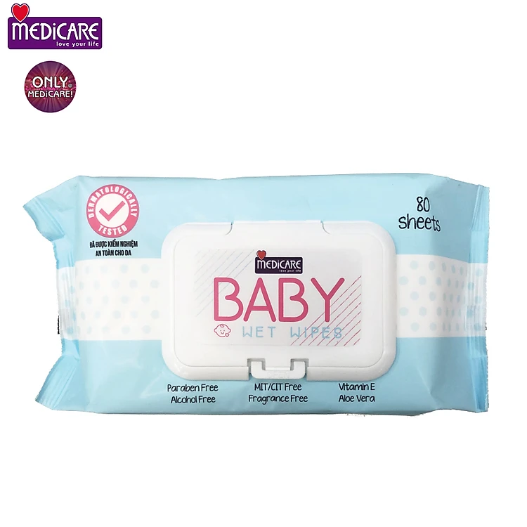 • Khăn ướt MEDiCARE Baby với công thức đặc biệt làm sạch chất bẩn hoặc vi khuẩn có hại một cách hiệu quả nhưng vẫn rất dịu nhẹ cho làn da mỏng manh của bé. Sản phẩm còn được kiểm định da liễu về tính an toàn của sản phẩm không mùi không chứa cồn chất huỳnh quang và các chất bảo quản.