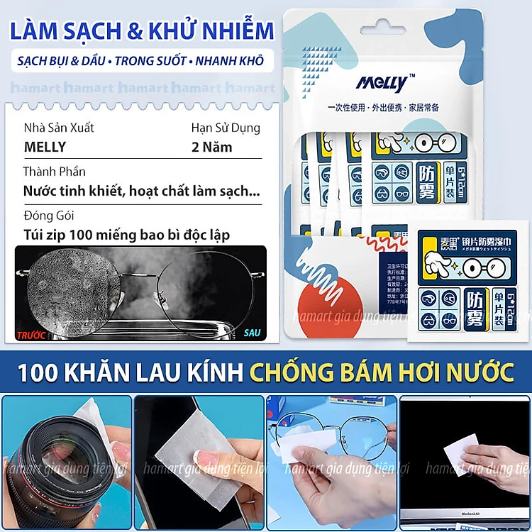 100 Miếng Giấy Lau Kính Cận Dùng 1 Lần Melly Khăn Lau Kính Mắt Khử Khuẩn Đa Năng Chống Hơi Nước