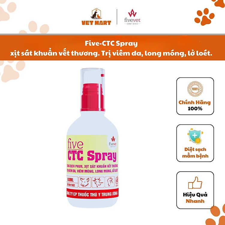 [100ml] Five-CTC Spray Dung dịch phun, xịt sát khuẩn vết thương, viêm da, viêm móng, long móng, lở loét.