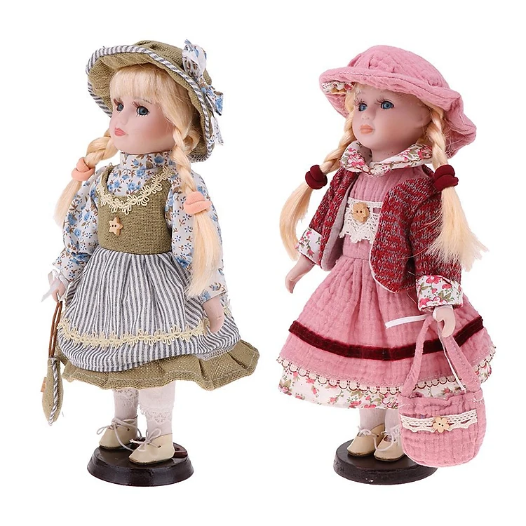 12 inch Elegant Porcelain Doll Collectible Miniatures, 2 Pieces Standing Victorian Girl Lady Doll with Stand, Hat, Shoes and Clothes