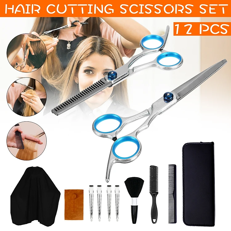 12PCS/Set Hair Cutting Thinning Scissor Set , Black Hairdressing Salon Home Professional Barber With Cape Brushes Clip