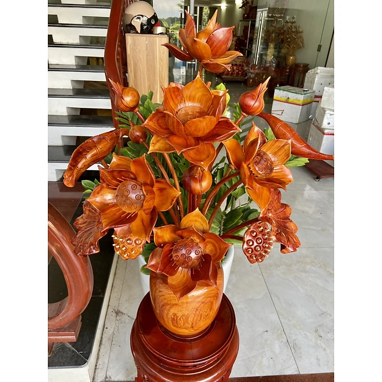 1binh hoa sen 19 hoa lá cành, trang trí phòng khách phòng thờ bằng gỗ hương đỏ