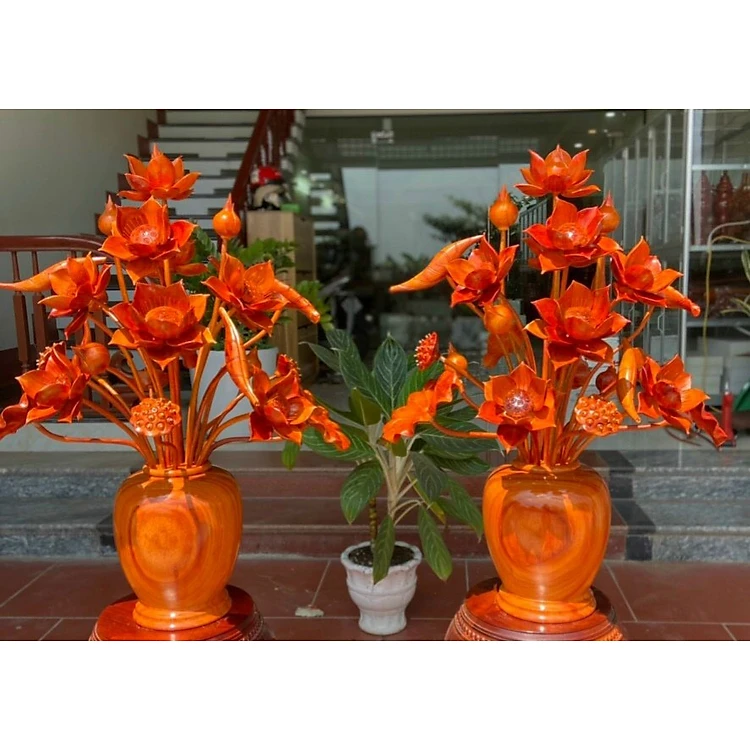 2 bình hoa sen 25 cành ,hoa ,lá gương ,trang trí phòng khách phòng thờ bằng gỗ hương đỏ cực đẹp