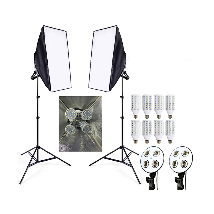 2 Softbox đuôi sứ 4 chuôi 50x70cm - 8 đèn Led 360 độ 480W - 2 chân đèn 2m