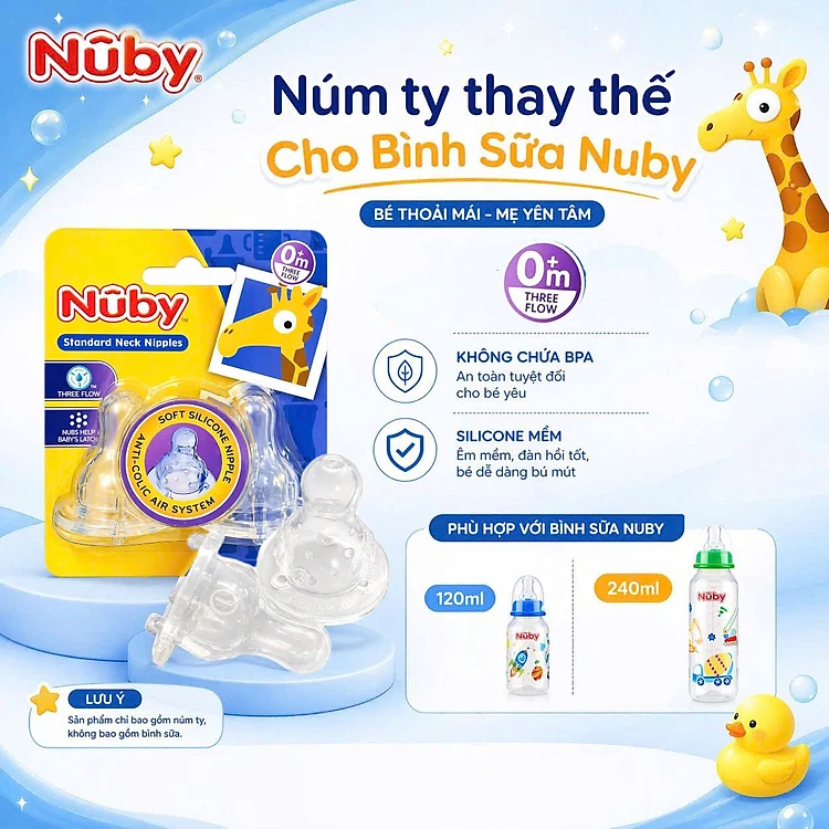 [ 024 ] Vỉ 2 núm ty thay thế bình sữa cổ thường Nuby 3 dòng chảy ( 0m+ )