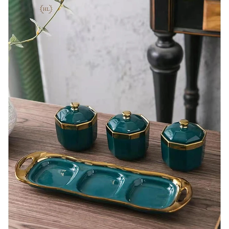 3 Hũ đựng gia vị chất liệu sứ kẻ viền vàng kèm thìa Inox có khay hứng dáng lục giác 2022 | GIA VỊ SỨ LỤC NĂNG XANH TRẮNG