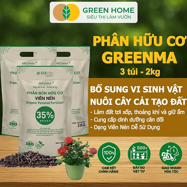 3 Túi Phân Bón Hữu Cơ Viên Nén Greenma 35%, GreenHome, Túi 2kg, Chuyên Cho Cây Cảnh, Hoa Màu Trồng Chậu
