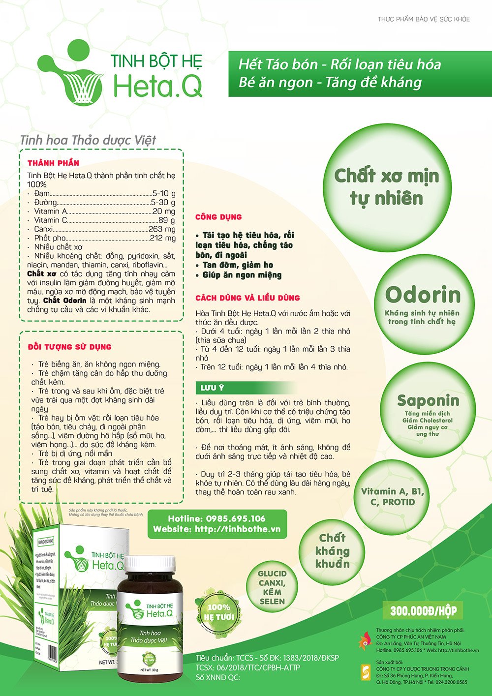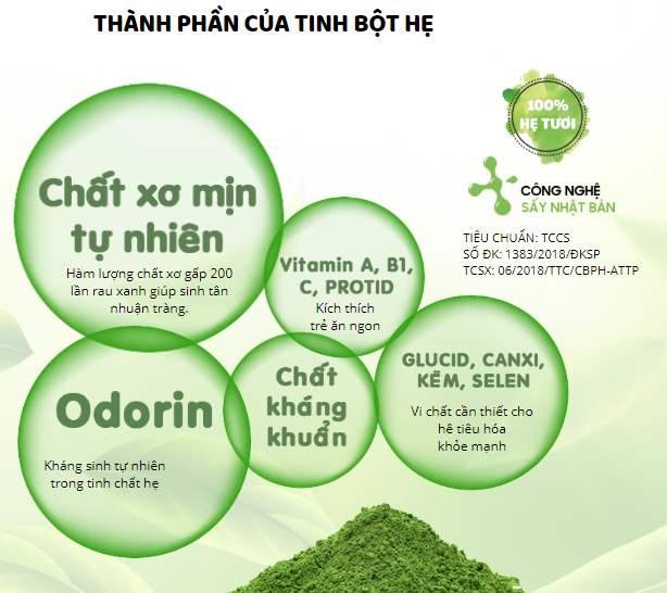 Tinh bột hẹ HETA.Q được bào chế từ 100% hẹ tươi, không chứa các chất phụ gia độc hại. Sử dụng Công nghệ sấy Thăng hoa NHẬT BẢN tăng chất xơ lên 200 lần so với rau xanh và hẹ tươi thông thường