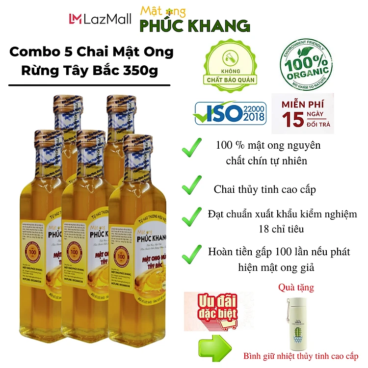 5 chai Mật ong nguyên chất hoa rừng tây bắc Phúc Khang (350g) - Hàng Chính Hãng - Mật ong sạch , mật ong cao cấp đạt tiêu chuẩn xuất khẩu - Bồi bổ cơ thể , tăng sức đề kháng