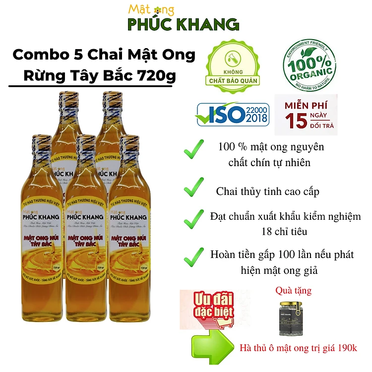5 chai Mật ong nguyên chất hoa rừng tây bắc Phúc Khang (720g) - Hàng Chính Hãng - Mật ong sạch , mật ong cao cấp đạt tiêu chuẩn xuất khẩu - Bồi bổ cơ thể , tăng sức đề kháng