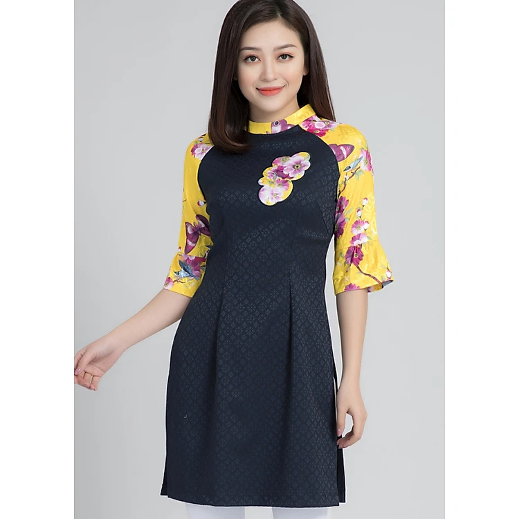 - Khác với áo dài truyền thống. Thiết kế dáng cách tân ngắn mang đến sự trẻ trung, cổ tròn cao, phối tay chuông điệu đà, họa tiết hoa tinh tế tạo điểm nhấn.