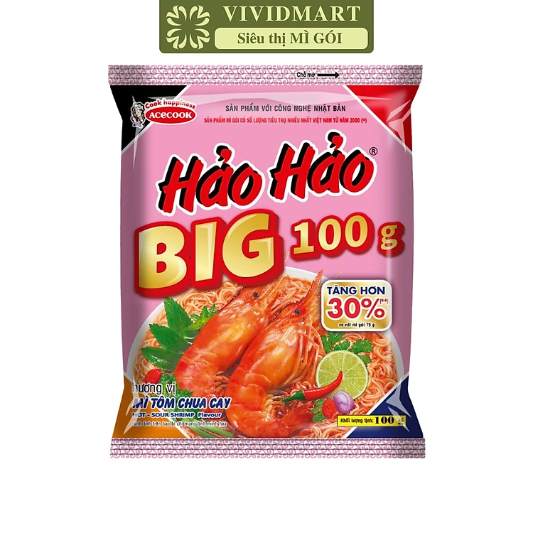 ACECOOK - Mì Hảo Hảo Big 100g Tôm Chua Cay, Mì Big 100 Hảo Hảo Tôm chua cay, Mì Hảo Hảo Big100 (100g/gói)