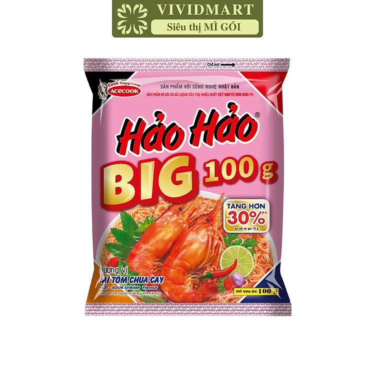 ACECOOK - Mì Hảo Hảo Big 100g Tôm Chua Cay, Mì Big 100 Hảo Hảo Tôm chua cay, Mì Hảo Hảo Big100 (100g/gói)