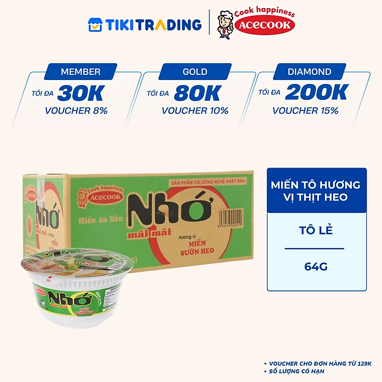 ACECOOK - Miến tô Nhớ Mãi Mãi hương vị Sườn heo, Tô Nhớ Mãi Mãi miến sườn heo, Miến Nhớ ăn liền (64g/tô)