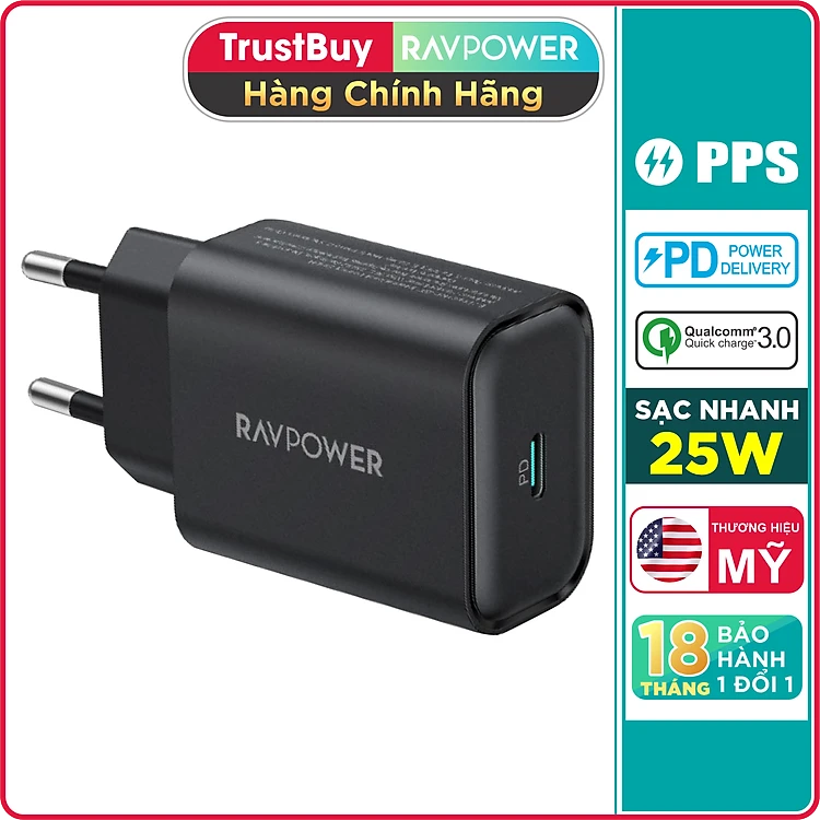 Adapter Củ Sạc Nhanh Đến 25W Type C PPS PD 3.0 QC 3.0 RAVPower RP-PC156 Dành Cho Điện Thoại Samsung, iPhone, iPad - Hàng Chính Hãng