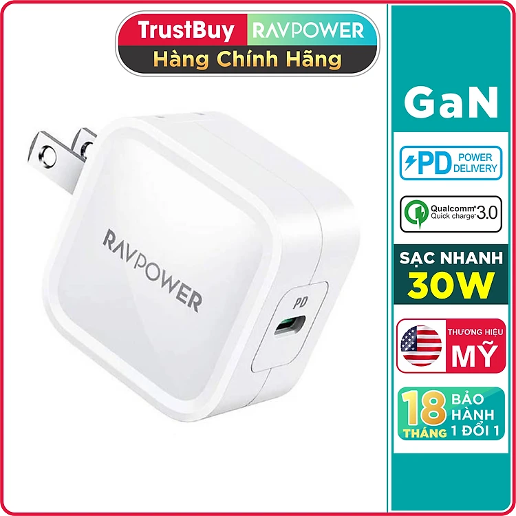 Adapter Sạc 1 Cổng Type-C 30W Công Nghệ GaN Hỗ Trợ Sạc Nhanh PD Power Delivery RAVPower RP-PC120 Với Đầu AC Gập - Hàng Chính Hãng