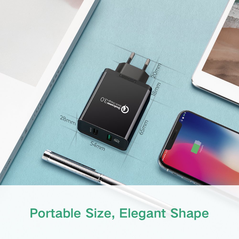 Với thiết kế nhỏ gọn, Adapter Sạc 2 Cổng 30W Ugreen Hỗ Trợ Sạc Nhanh QC 3.0 rất thuận tiện để bạn có thể mang theo đi bất cứ đâu.