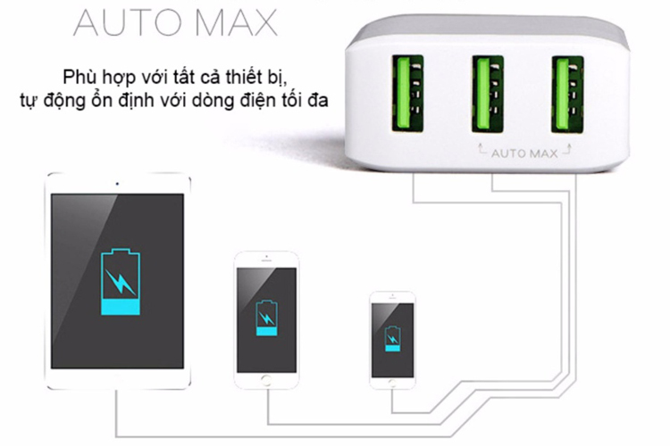 - Adapter Sạc 3 Cổng Auto Max 5V/3A được trang bị 3 cổng sạc cho bạn 1 lần sạc được 3 thiết bị, giúp tiết kiệm thời gian hiệu quả.
