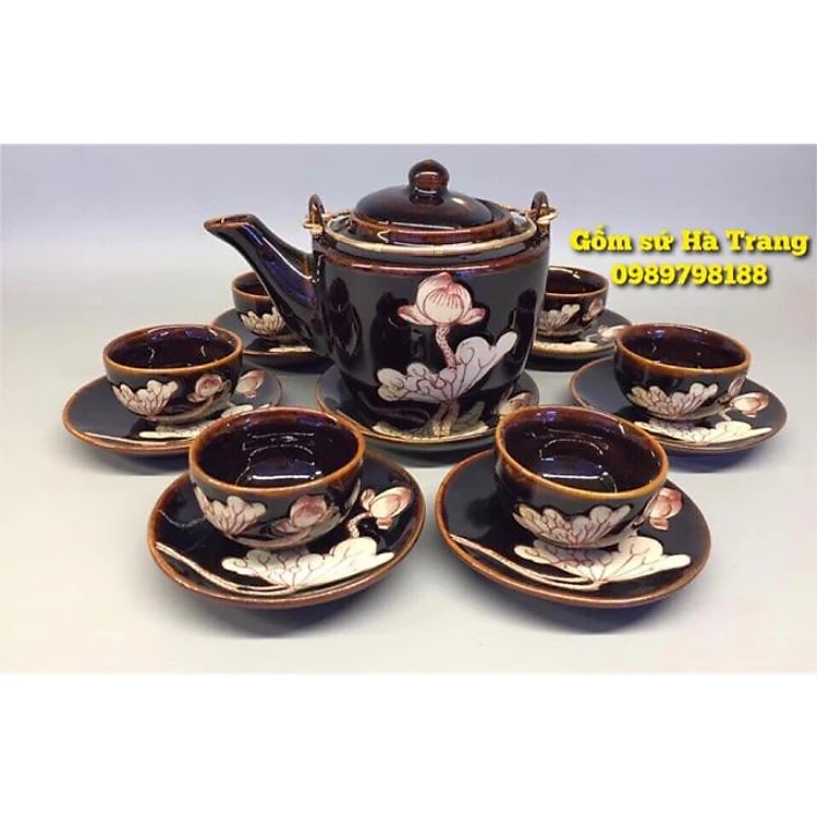 Ấm chén Bát Tràng cao cấp khắc hoạ tiết sen Ấm quai đồng