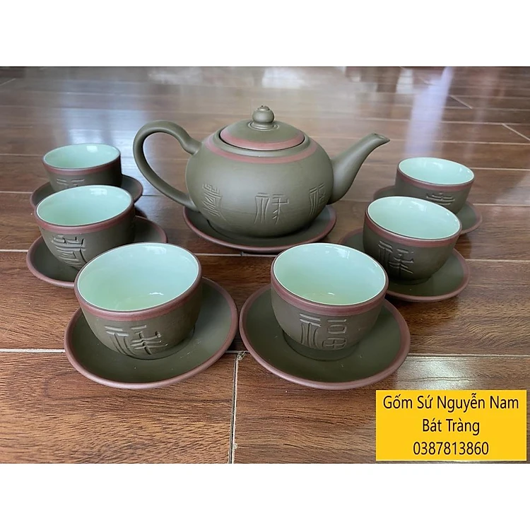 Ấm Chén Trà Tử Sa Khắc Chữ Phúc Lộc Thọ Bát Tràng Tống Xanh Chỉ Đỏ lòng xanh