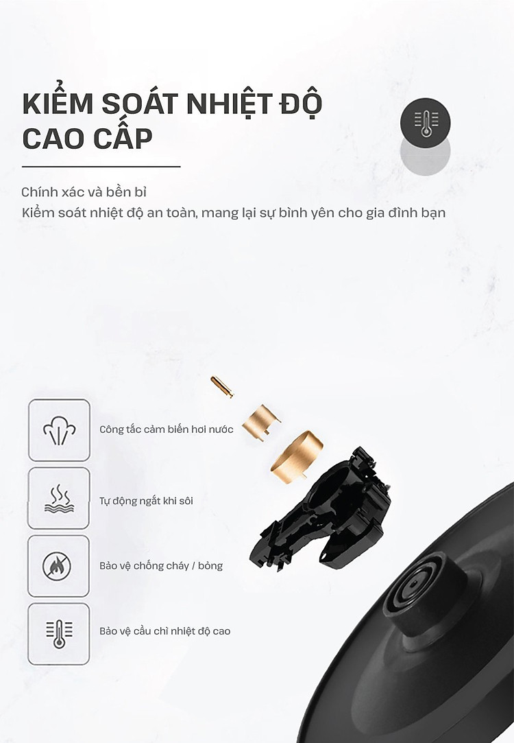 Ấm có chế độ ngắt tự động khi nước sôi hoặc cạn nước, đảm bảo an toàn tối đa cho người sử dụng (quên/bận rộn công việc khác). Chức năng này còn giúp làm tăng tuổi thọ sản phẩm và phòng chống cháy nổ.