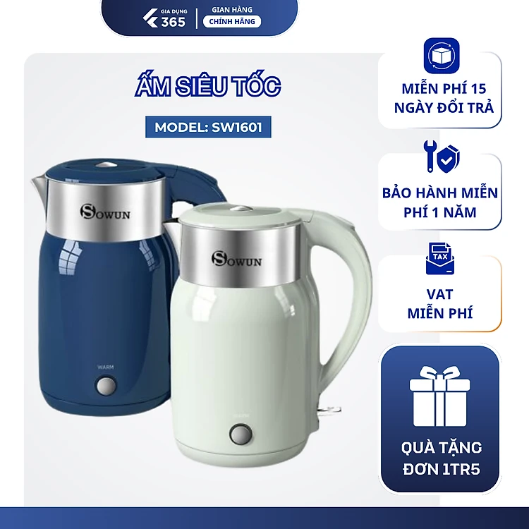 Ấm Siêu Tốc Chính Hãng SOWUN SW1601 1.8L, Chất Liệu INOX Nguyên Khối, Công Suất 1800W Đun Sôi Nước Nhanh