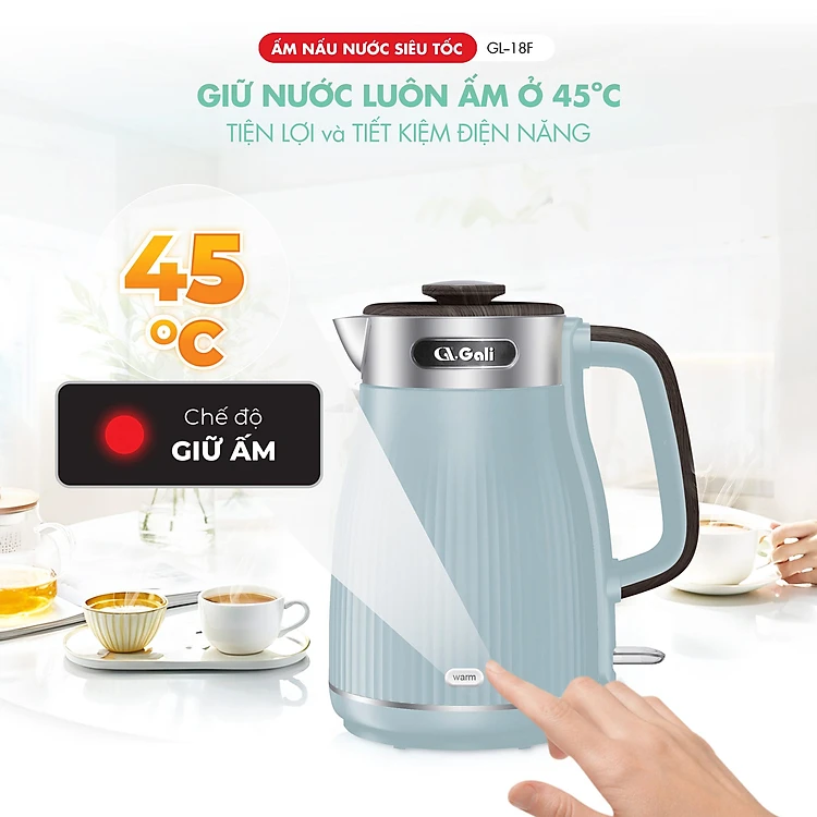 Ấm siêu tốc Gali GL-18F - 1.8 Lít, thiết kế 2 lớp cách nhiệt, Inox 304 chất lượng cao, có chức năng giữ ấm. Hàng chính hãng bảo hành 24 tháng