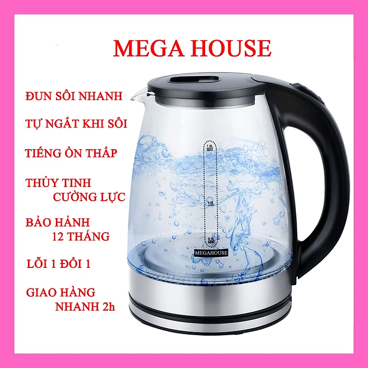 Ấm siêu tốc thủy tinh cao cấp MEGA HOUSE electric kettle MG168 bình siêu tốc loại 1.8L 1500w sôi nhanh, tự ngắt, bền đẹp, đèn led - hàng chính hãng.