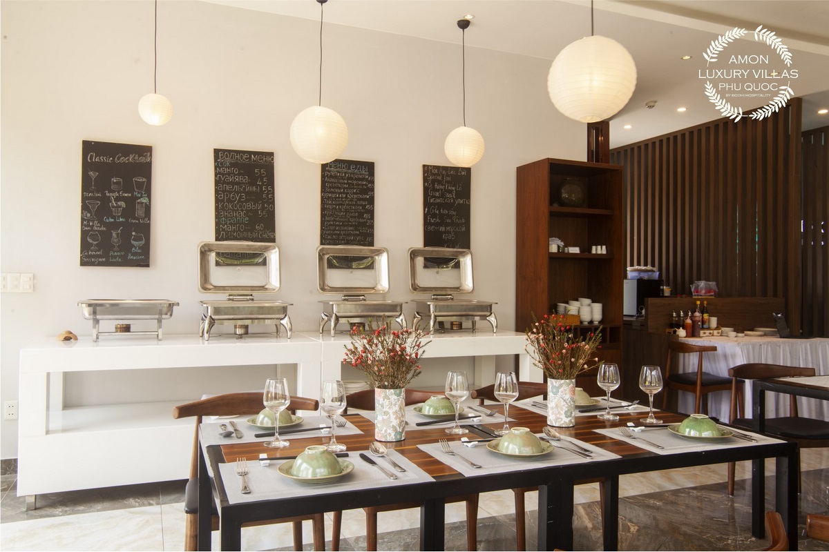 Điều đặc biệt của Amon Luxury Villas 4* Phú Quốc là Nhà hàng Andochine. Nhà hàng của Amon Luxury Villas 4* Phú Quốc mang phong cách Địa trung hải, phục vụ đầy đủ các món Á Âu, hải sản tươi sống trong ngày.