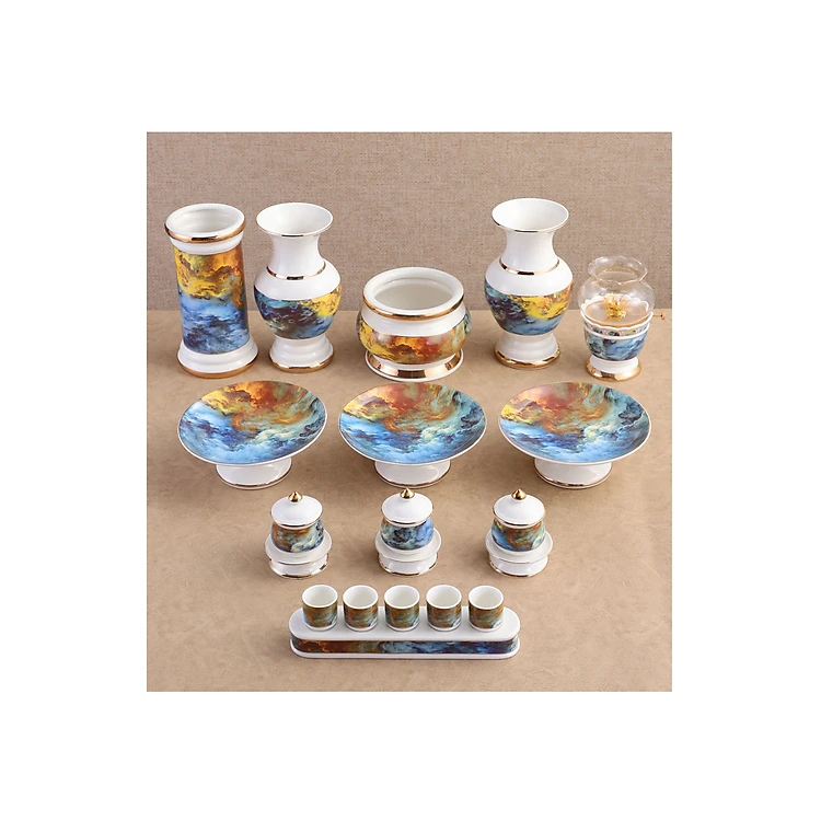BỘ SẢN PHẨM THỜ CÚNG THƯỜNG BAO GỒM: 1 bát hương (lu hương), 2 bình bông, 2 đĩa trái cây, 3 hoặc 5 ly nước,  1 hoặc 2 đế nến, 3 chun nước (hũ gạo), 1 ống nhang, 1-2 đèn