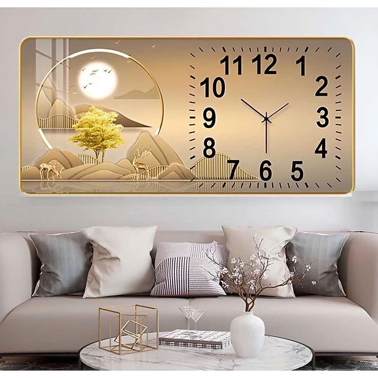 (ẢNH THẬT)Tranh đồng hồ hươu vàng nghệ thuật bo viền vàng trang trí quà tặng tân gia khai trương
