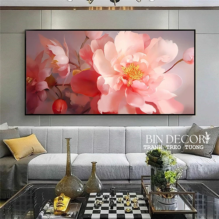 (ẢNH THẬT) Tranh treo tường hoa mẫu đơn hồng có sẵn khung kèm đinh