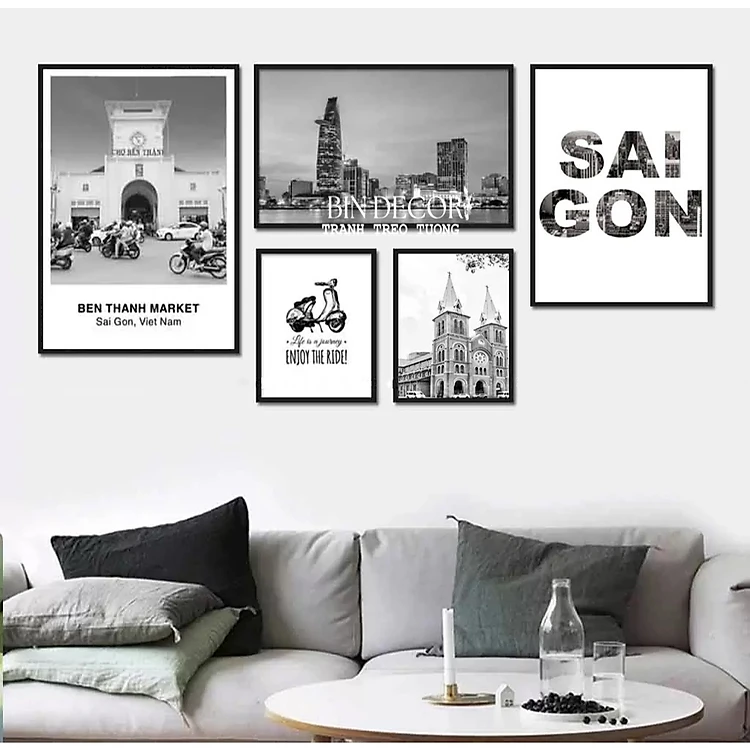 (ẢNH THẬT) Tranh treo tường trang trí decor sài gòn trắng đen có sẵn khung