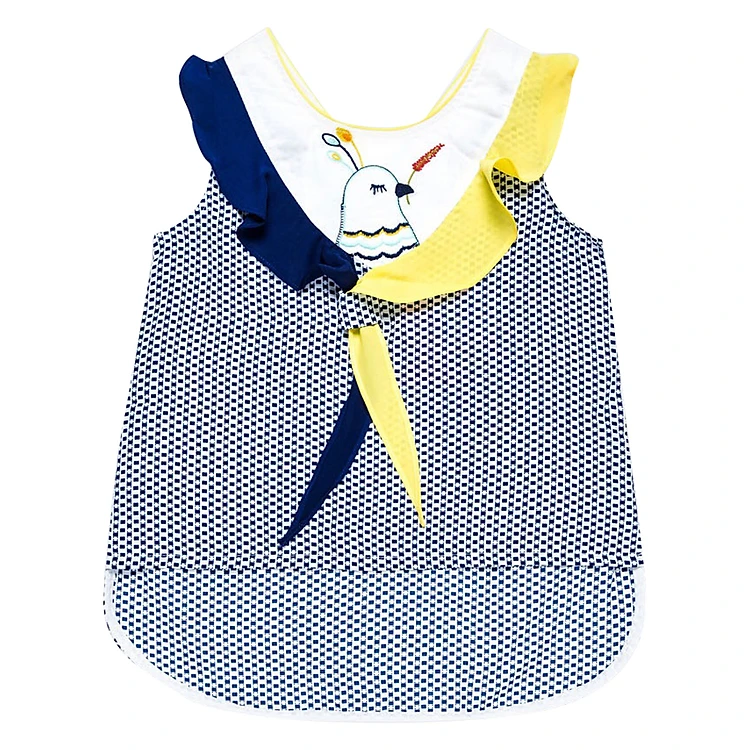 - Áo caro trắng xanh được thiết kế sát nách cổ tròn thoáng mát, phần cổ áo được làm nổi bật với phần bèo và dây 2 màu xanh vàng nổi bật và nền trắng ở giữa có thêu hình chim độc đáo có màu sắc tươi sáng được thêu tỉ mỉ vừa mang lại nét nữ tính vừa mang nét cá tính cho các bé gái, 2 vạt áo được cách điệu trước ngắn sau dài tạo nên phong cách thời trang hơn.