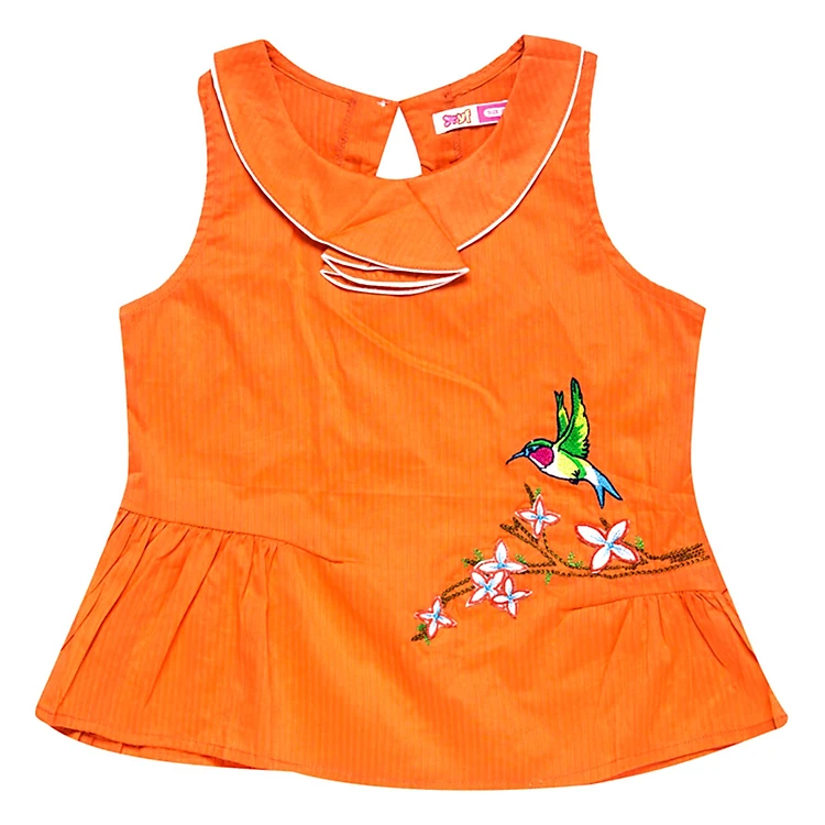 - Áo thun màu cam được thiết kế sát nách thoáng mát, phần cổ áo được viền trắng nổi bật và xếp lớp ở giữa áo tạo nét khác biệt và xinh xắn cho chiếc áo, kết hợp với họa tiết chim én và hoa ở một bên góc áo với màu sắc tươi sáng góp phần làm cho chiếc áo thêm nổi bật và thêm phần đáng yêu.