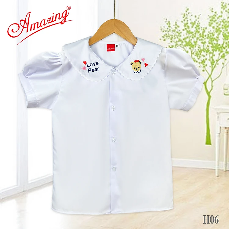 Áo bé gái đi học cấp 1, cổ lá sen thêu dễ thương, tay bồng, vải kate trắng mềm mát, size to đến 60kg