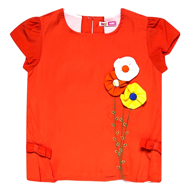 - Áo thun màu cam được thiết kế ngắn tay cổ tròn thoáng mát, họa tiết hoa đắp nổi, màu sắc tươi sáng nổi bật và mang lại nét nữ tính cho các bé gái, ngoài ra áo còn được gắn nơ 2 bên vạt trước làm tăng thêm nét dễ thương, đáng yêu cho các bé.