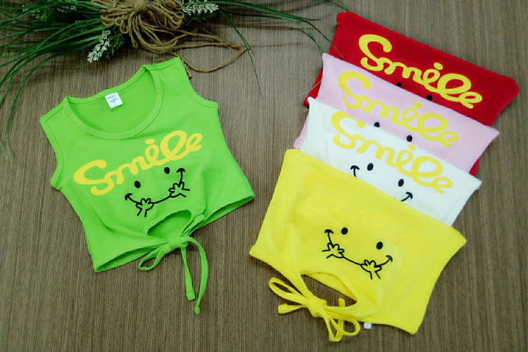 - Thiết kế tay sát nách cổ tròn, trang trí dòng chữ Smile nổi bật với hình mặt cười dễ thương, cột thắt nơ phía trước giúp bé nhìn rất đáng yêu và cá tính.