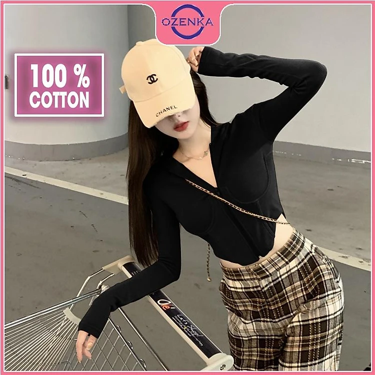 Áo cardigan croptop tay dài có mũ ôm nữ, áo khoác ngoài kéo khoá đen trắng thun gân cao cấp 100% cotton đẹp