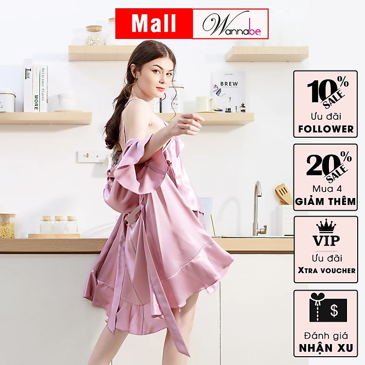 Áo choàng ngủ phi lụa kimono cao cấp Wannabe KIS22 tay loe phối bèo tùng nhẹ nữ tính xinh xắn