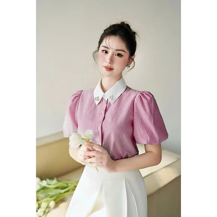 Áo cổ sơ mi kết ngọc tay phồng