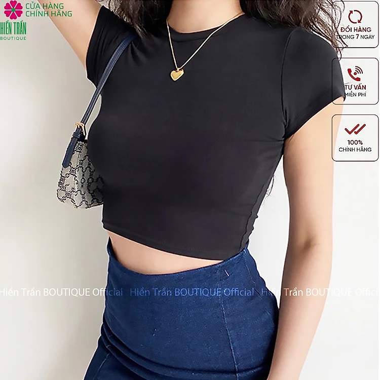 Áo croptop Hiền Trần BOUTIQUE cổ tròn cộc tay vải thun ôm body crotop nữ cotton co giãn tốt