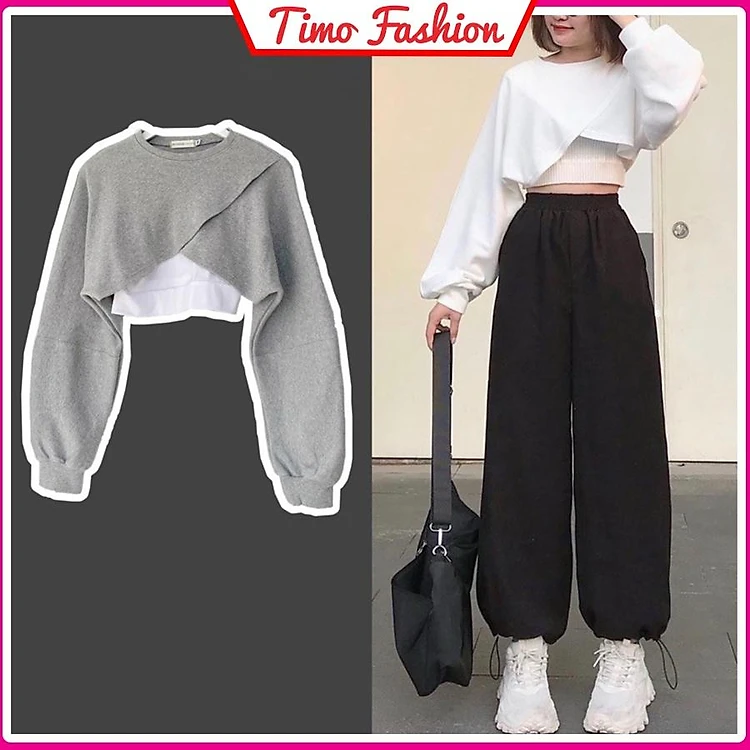 Áo croptop tay dài form rộng, áo kiểu nữ croptop tay phồng co giãn tặng kèm bra Ulzzang, phong cách Hàn Quốc, AO011