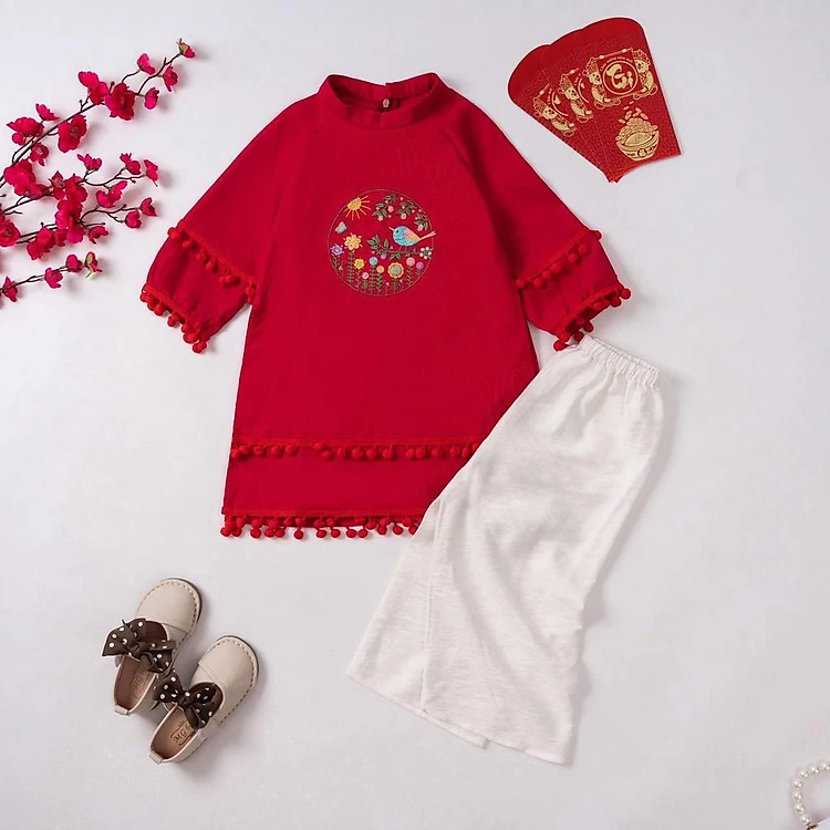 Áo dài bé gái linen phối ren pon pon thêu hình chim và hoa cỏ kèm quần lụa cực xinh MamLa