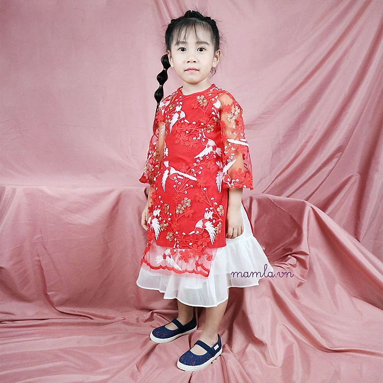 Áo dài bé gái thêu ren chim én cách tân set áo kèm chân váy voan 2 lớp MamLa