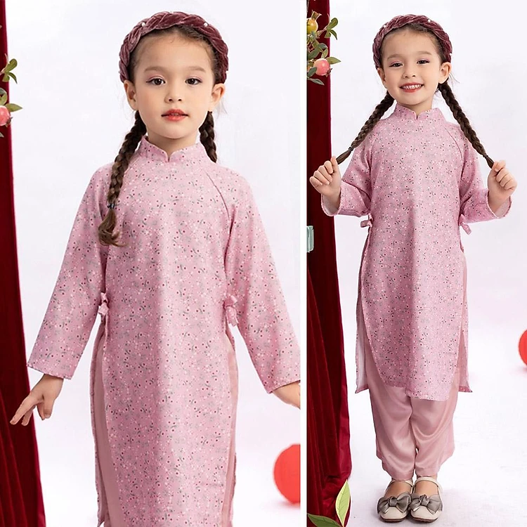 Áo dài bé gái truyền thống hoa nhí vải nhung mềm nhẹ đính nơ eo kèm quần lụa cực xinh có TẶNG bờm nhung MamLa