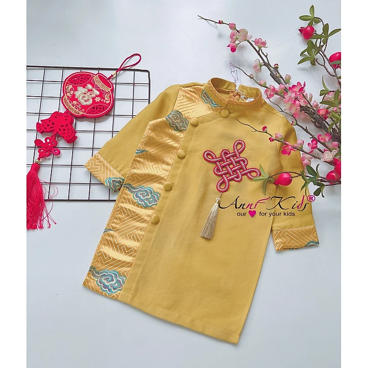 Áo dài cách tân bé trai, Áo tết cho bé 1-10 tuổi nút kết cát tường hàng thiết kế chất liệu tap ta phối gấm vân mây