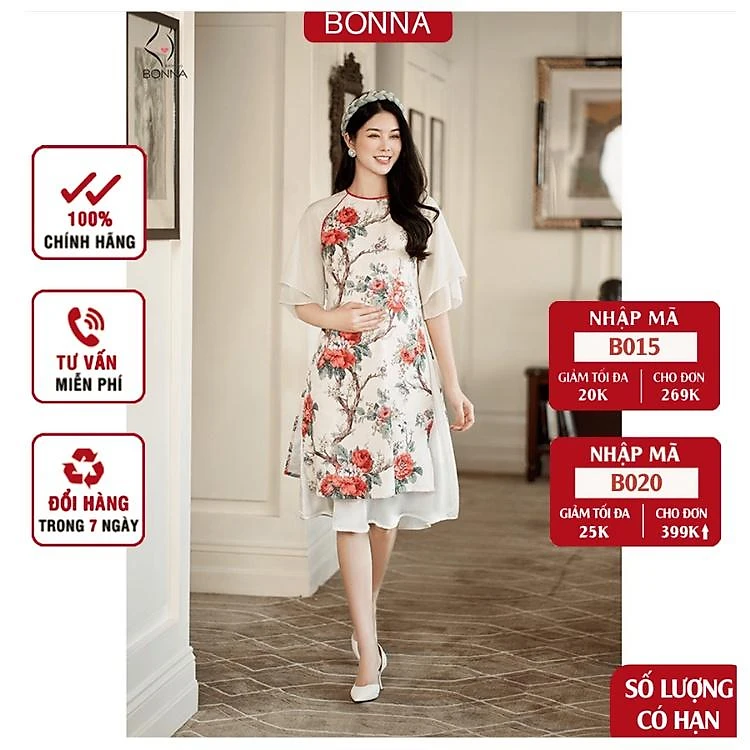 Áo dài cách tân BONNA dành cho mẹ bầu, chất liệu gấm vân sang trọng phối tay bèo 2 lớp nữ tính, thanh lịch CT111