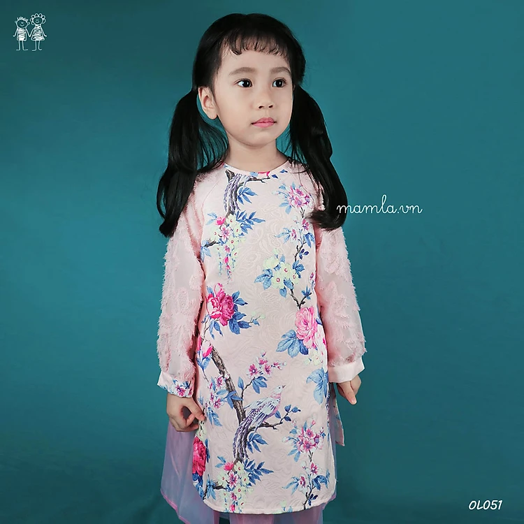 Áo dài cách tân cho bé gái hình chim và hoa điệu đà áo kèm chân váy và nơ cài tóc MamLa
