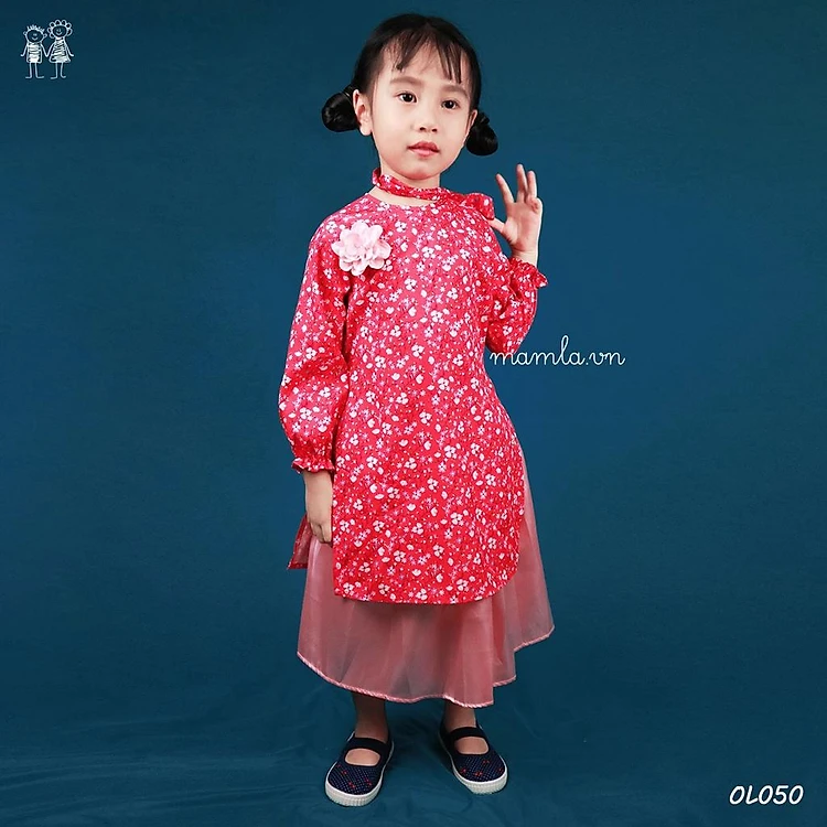 Áo dài cách tân hoa nhí màu đỏ cho bé gái áo kèm chân váy và bờm MamLa